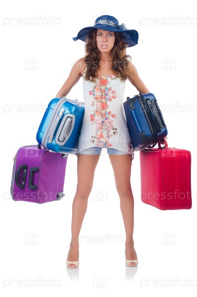 Женщина, готовящаяся к отпуску, с чемоданом на белом фоне