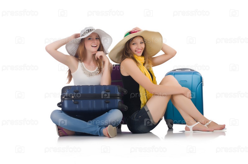 Женщины с чемоданами на белом фоне