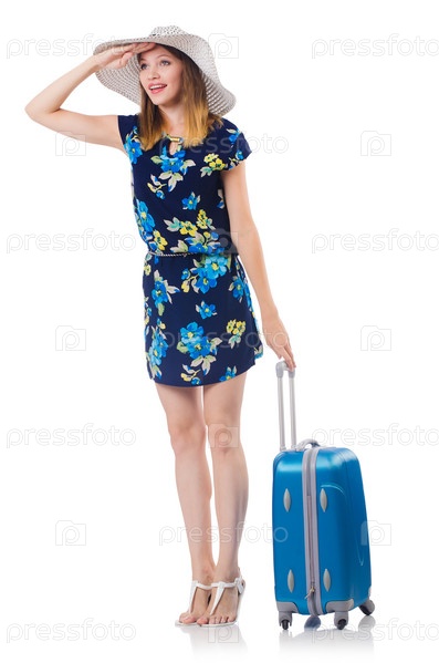 Женщина с чемоданами на белом фоне