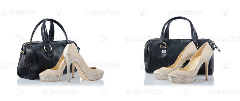 Коллаж с обувью и сумками на белом фоне