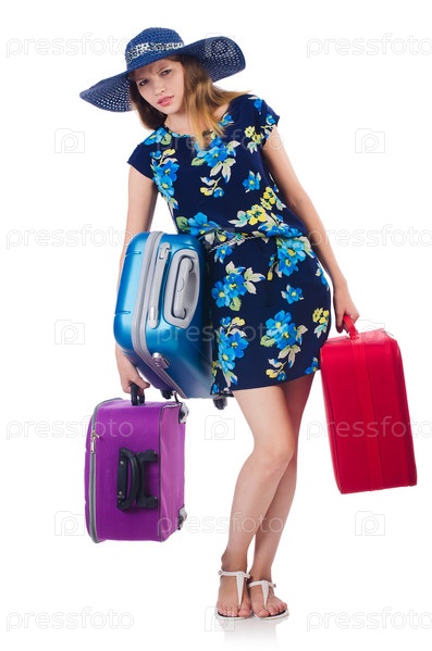 Женщина с чемоданами на белом фоне
