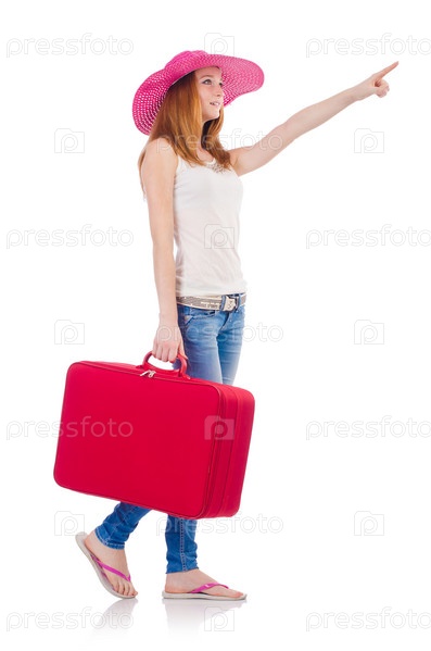 Девушка с чемоданами, изолированная на белом фоне