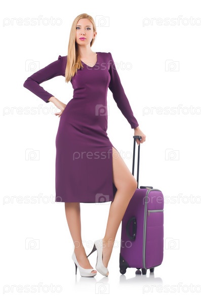 Женщина с чемоданом на белом фоне