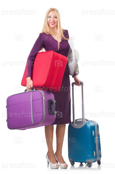 Женщина с чемоданом на белом фоне