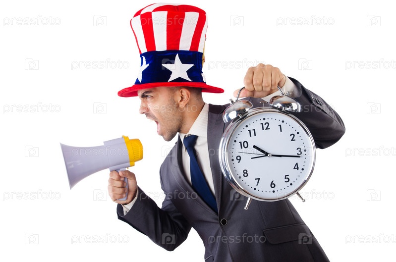 Человек с громкоговорителем и будильником