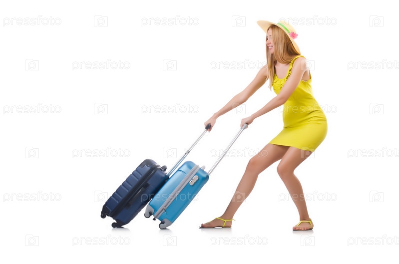 Женщина с чемоданами на белом фоне