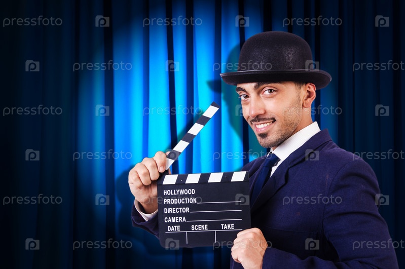 Мужчина с хлопушкой на фоне занавеса