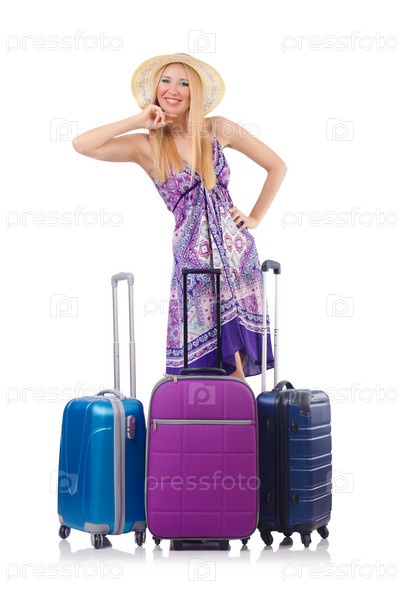 Женщина с чемоданами на белом фоне