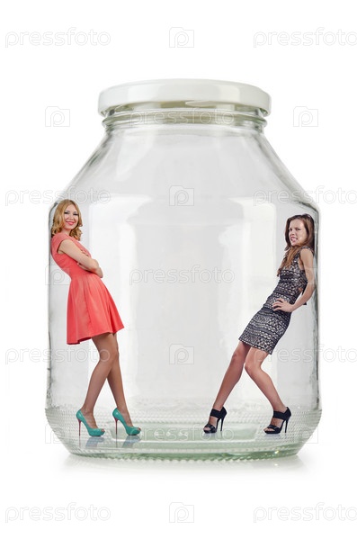 Женщина в стеклянной банке, изолированная на белом фоне