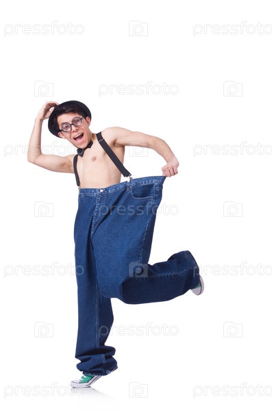 Забавный человек с брюками, изолированный на белом фоне