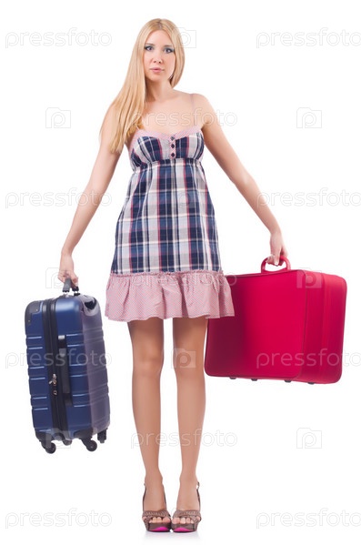 Женщина с чемоданом на белом фоне
