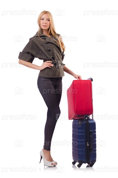 Женщина с чемоданом на белом фоне