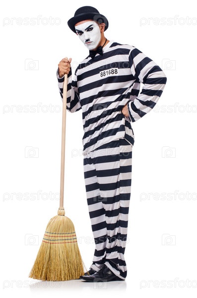 Заключенный с метлой, изолированный на белом фоне