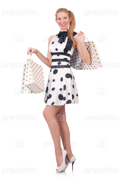 Девушка с удачными покупками на белом фоне