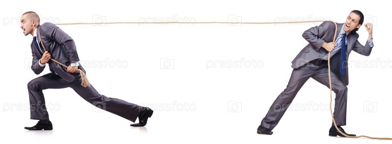 Мужчины тянут канат на белом фоне