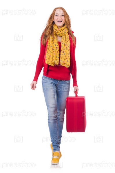 Женщин с чемоданом на белом фоне