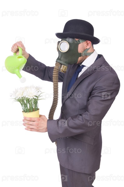 Бизнесмен в противогазе, изолированный на белом фоне