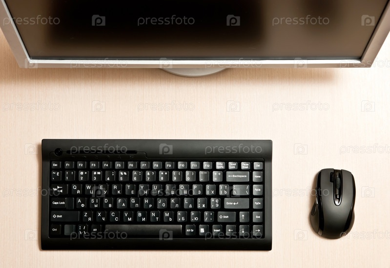 Черная клавиатура, мышь и монитор на столе. Вид сверху
