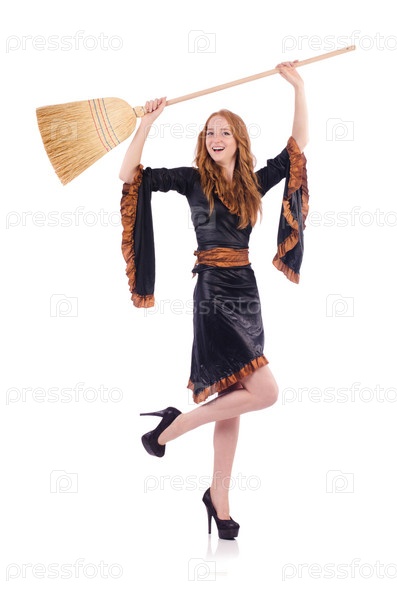 Ведьма с метлой на белом фоне