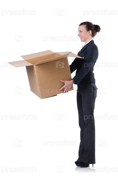 Женщина с коробкой на белом фоне
