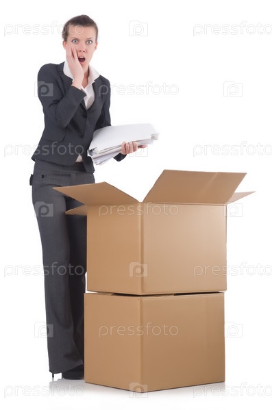 Женщина с коробками на белом фоне