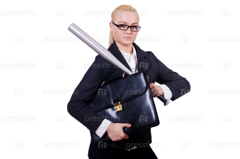 Бизнес-леди с бейсбольной битой на белом фоне
