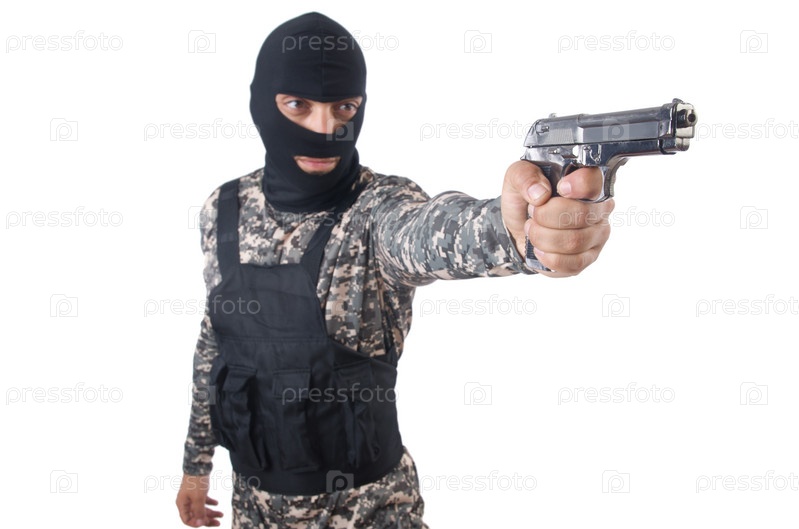 Солдат в камуфляже с оружием на белом фоне