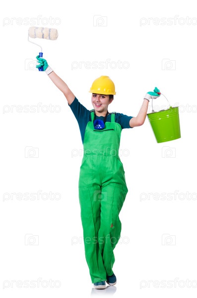 Женщина маляр с кистью на белом фоне