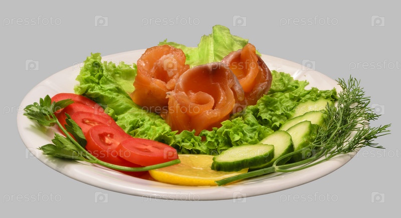Рулеты из филе красной рыбы с зеленью и овощами