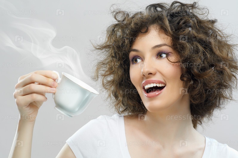 Молодая девушка с чашкой кофе на светлом фоне