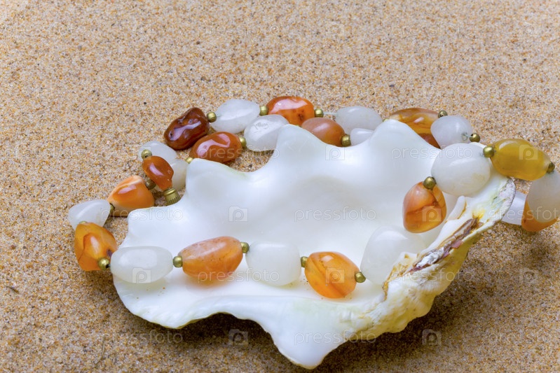 Морская раковина и бусы на фоне песка