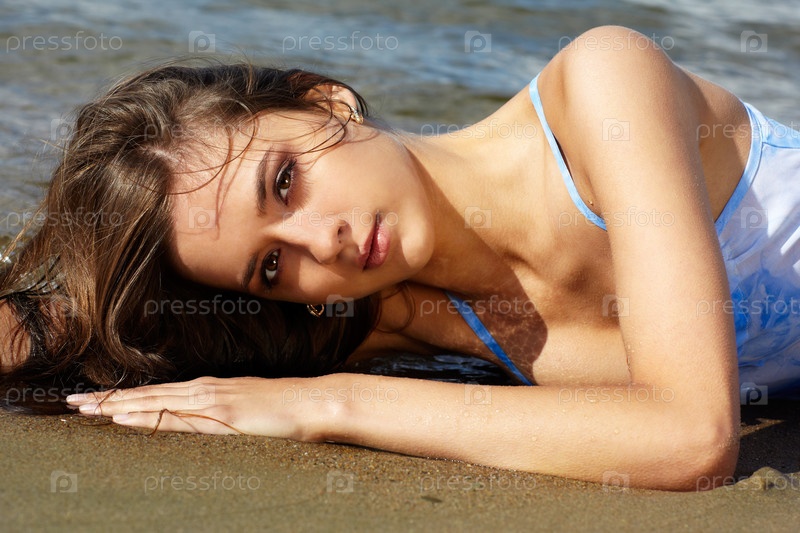 Девушка в голубом платье позирует на пляже