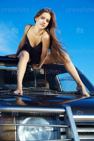 Девушка в черном платье позирует на капоте внедорожника