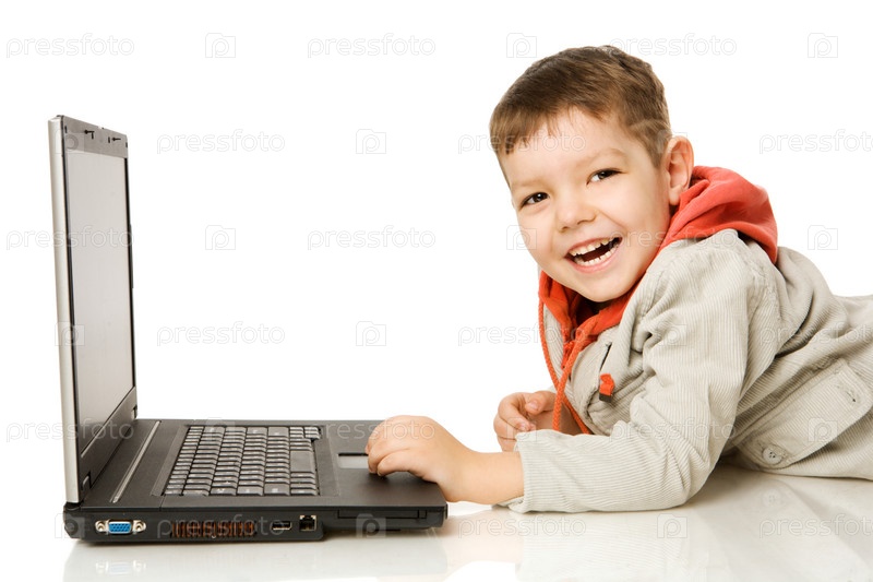 Маленький мальчик с ноутбуком на белом фоне