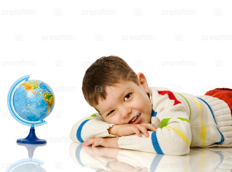 Маленький мальчик и глобус на белом фоне
