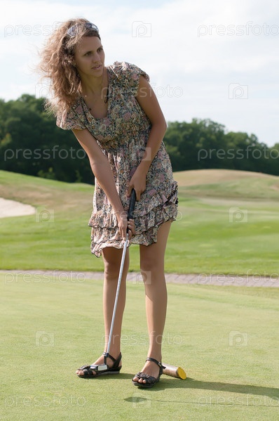 Девушка замахивается клюшкой для гольфа
