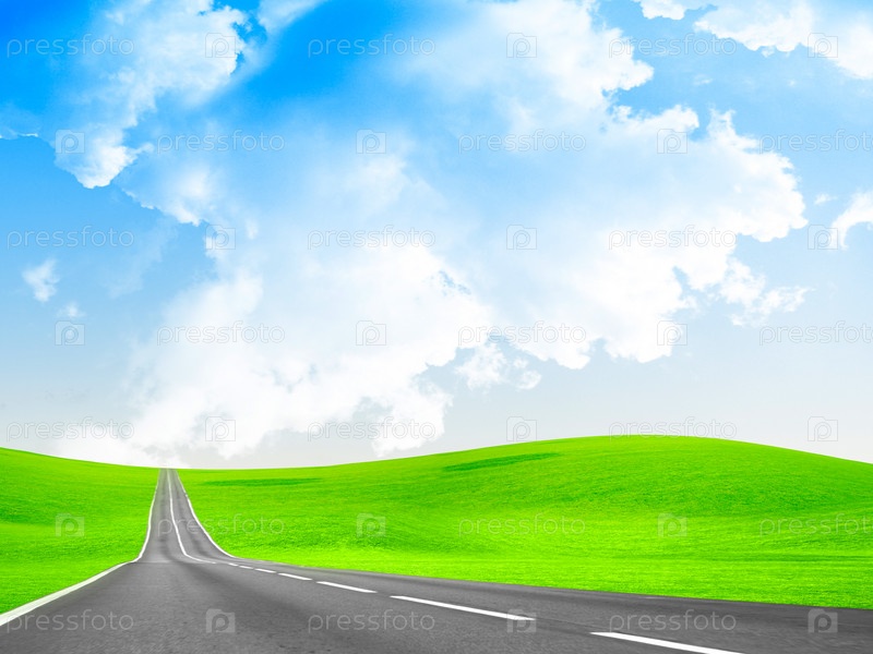 Иллюстрация с изображением асфальтированной дороги и облачного неба
