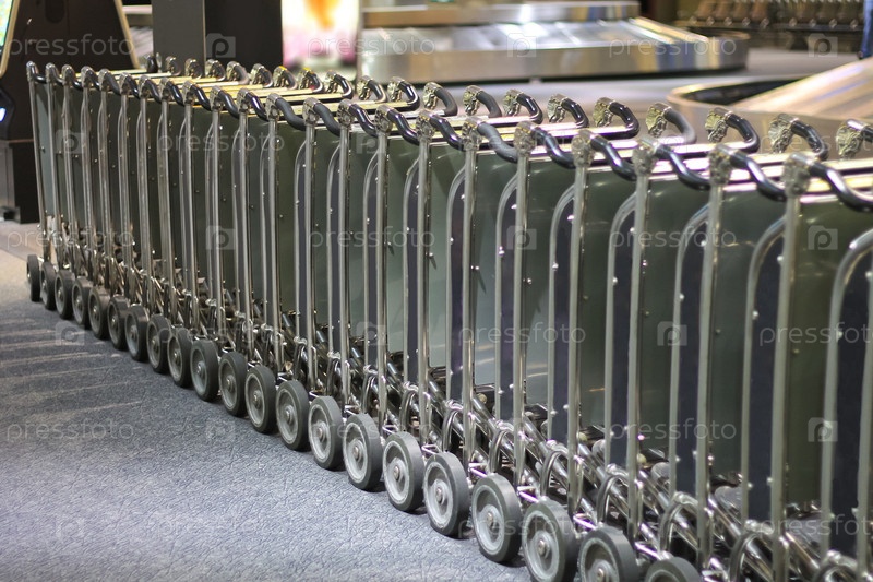 Ряд тележек для багажа в зале прибытия аэропорта
