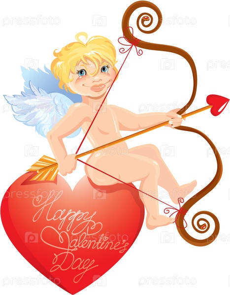 Милый ангелочек со стрелой и луком сидит на большом красном сердце. Дизайн открытки, день Святого Валентина