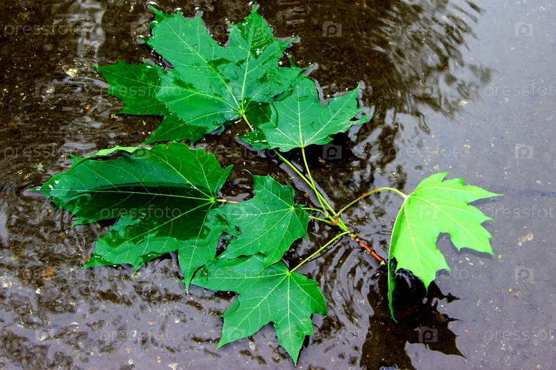 Ветка клена с зелеными листьями в луже