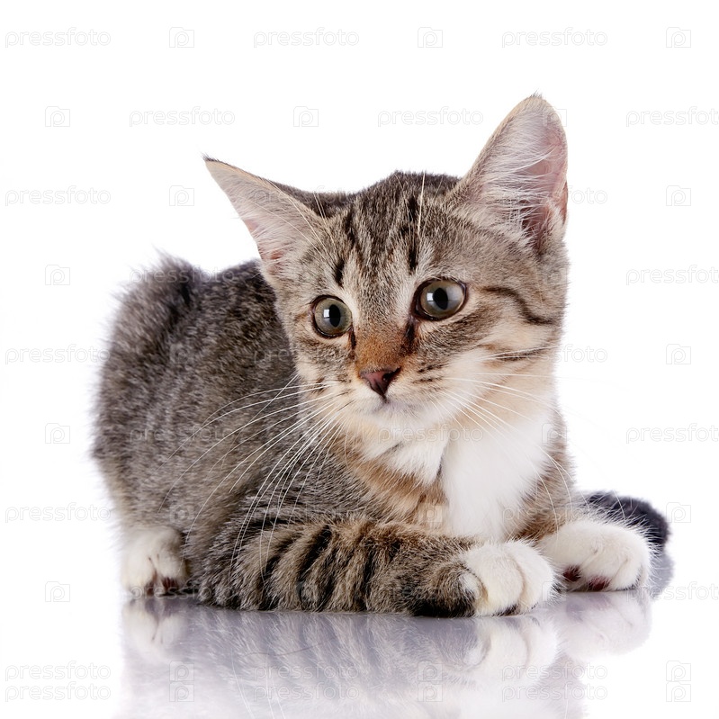 Полосатый беспородный котенок на белом фоне