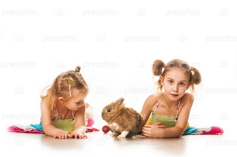 Две девочки играют с Пасхальным зайцем на белом фоне