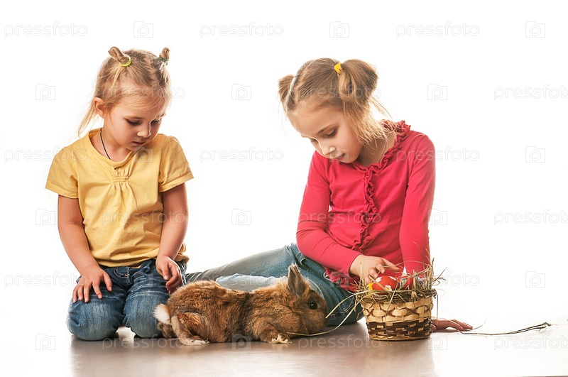 Две девочки играют с Пасхальным зайцем на белом фоне