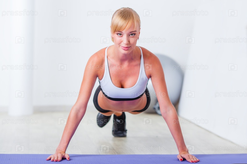 Блондинка делает отжимания