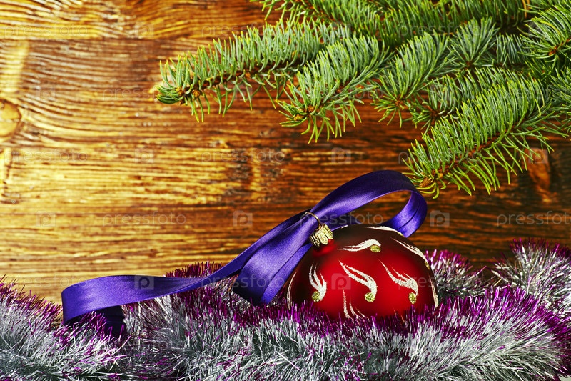 Рождественские украшения. Красный шар с фиолетовой лентой, елка и мишура. Выборочный фокус