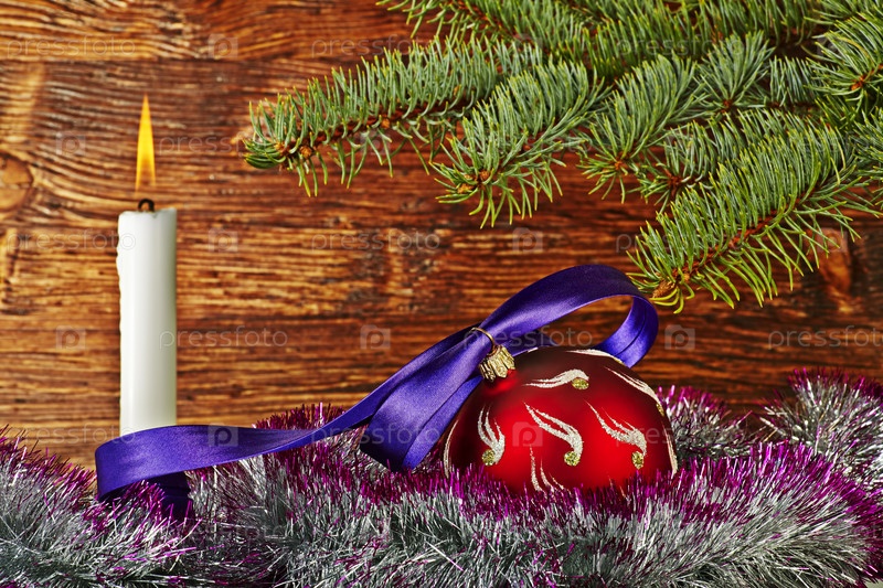 Рождественские украшения. Красный шар, фиолетовая лента, елка, свечи и деревянный фон. Выборочный фокус