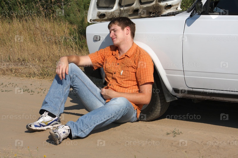 Мужчина сидит у автомобиля с открытым капотом