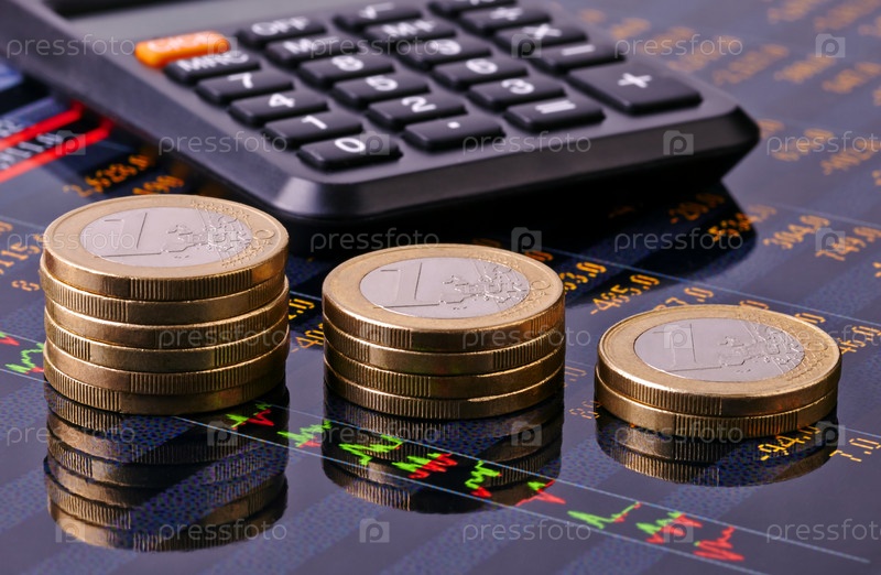Диаграмма роста из монет евро, калькулятор и финансовые диаграммы. Выборочный фокус