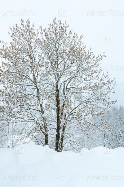 Дерево с осенними листьями в горах зимой