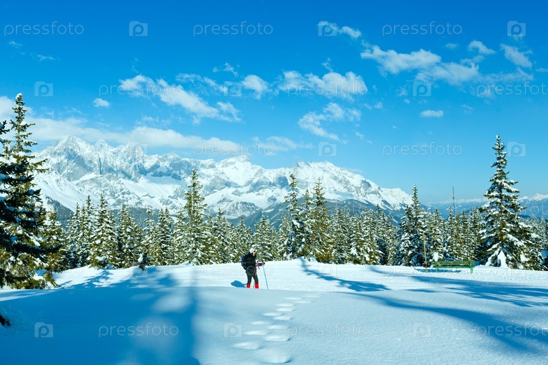 Зимний горный пейзаж и женщина на прогулке